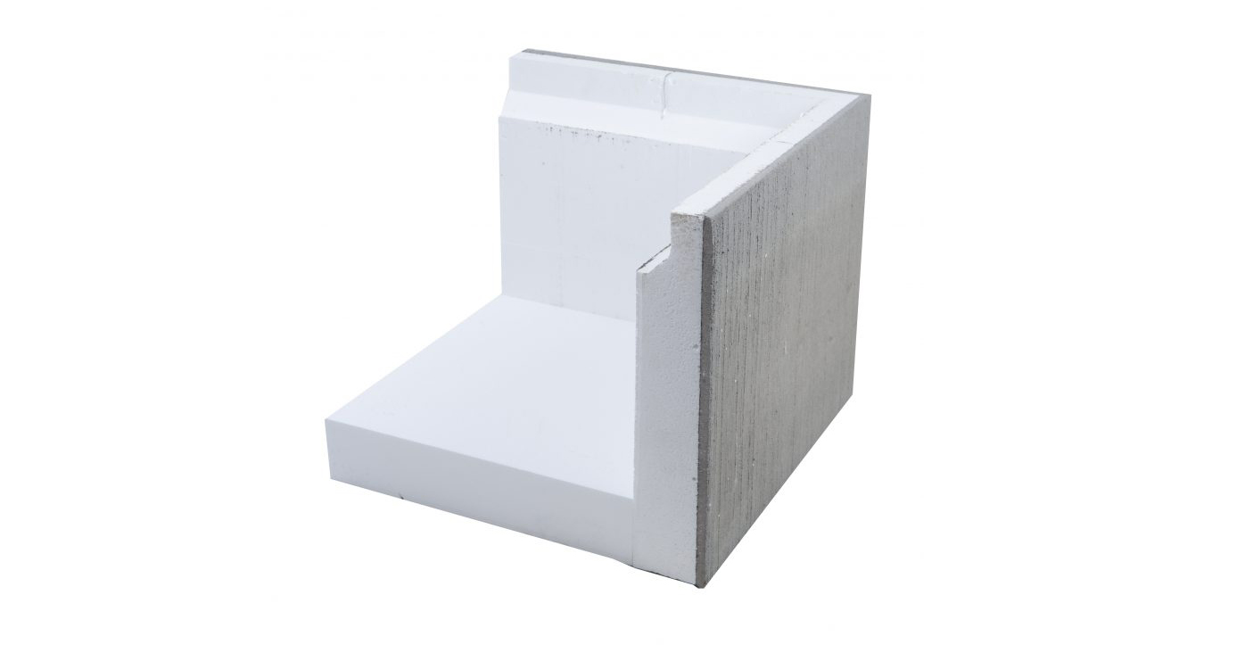 The element is made of EPS with a surface layer of 10 mm fiber-reinforced plastered concrete. The brushed surface gives the foundation a rustic look. Assembly takes place in a sparse form with cast-in-place seam wire for anchoring.